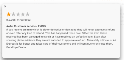 一位消费者在AppStore上留言称,自己在Fanno上下单后,收到的产品因为运输过程不当,导致商品有所损坏,于是该买家找平台客服理论。即便已经拍照上传了证据,但Fanno服务人员还是不同意给其退货退款。因此该消费者毫不犹豫地给了平台1星差评。