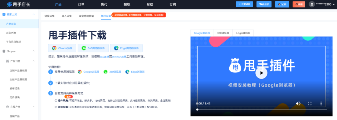 假设你在Shopee上开的是玩具店,在定价前先通过甩手店长配备的插件批量采集商品,有视频操作讲解,所以不用担心不会用插件或者不会安装的问题。