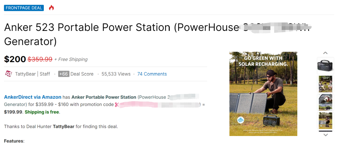在美国最大的促销网站Slickdeals上,众多知名大卖发布了促销活动。Anker一款原价为359.99美元的便携式发电机如今仅需200美元,折扣力度为44%,降价幅度高达160美元左右。