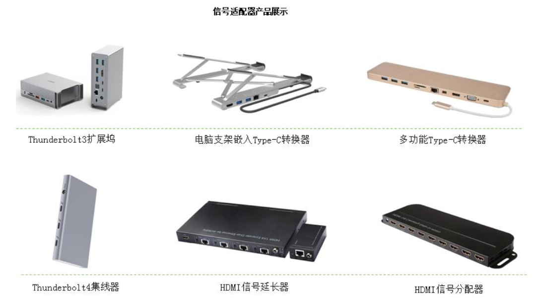 2. 信号适配器:应用于电视、电脑、笔记本、手机等设备的信号的转换、切换、延长、放大、扩展等,俗称转换器、 拓展坞、Dongle、Hub或Docking,覆盖了当前市场的主流接口以及Thunderbolt4。