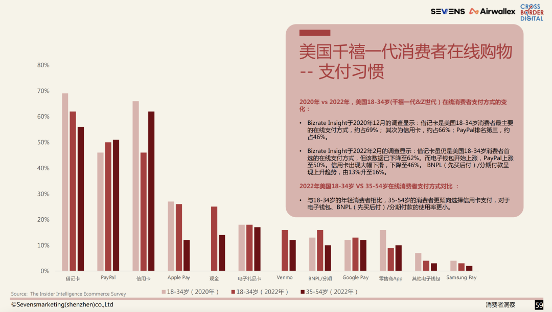 Michelle:2022年,70%的美国千禧一代消费者更喜欢在移动端进行消费付款。借记卡、PayPal和信用卡是他们首选的在线支付方式,分别占62%、50%和46%。BNPL(先买后付)成为后起之秀,越来越受到年轻人喜欢。2021年,有30.3%的美国千禧一代在使用BNPL,并预计在2025年上涨至40.6%。