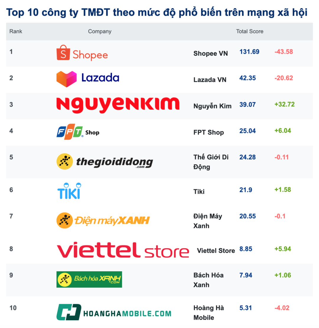 去年5月,Shopee和Lazada继续保持着前2名的排名。在这方面,Shopee以小型项目为主, 如:Shopee tặng bạn("这送给你",1,773,177次互动)和Minigame Sale giữa năm tới("迷你销售",941,301次互动)。
