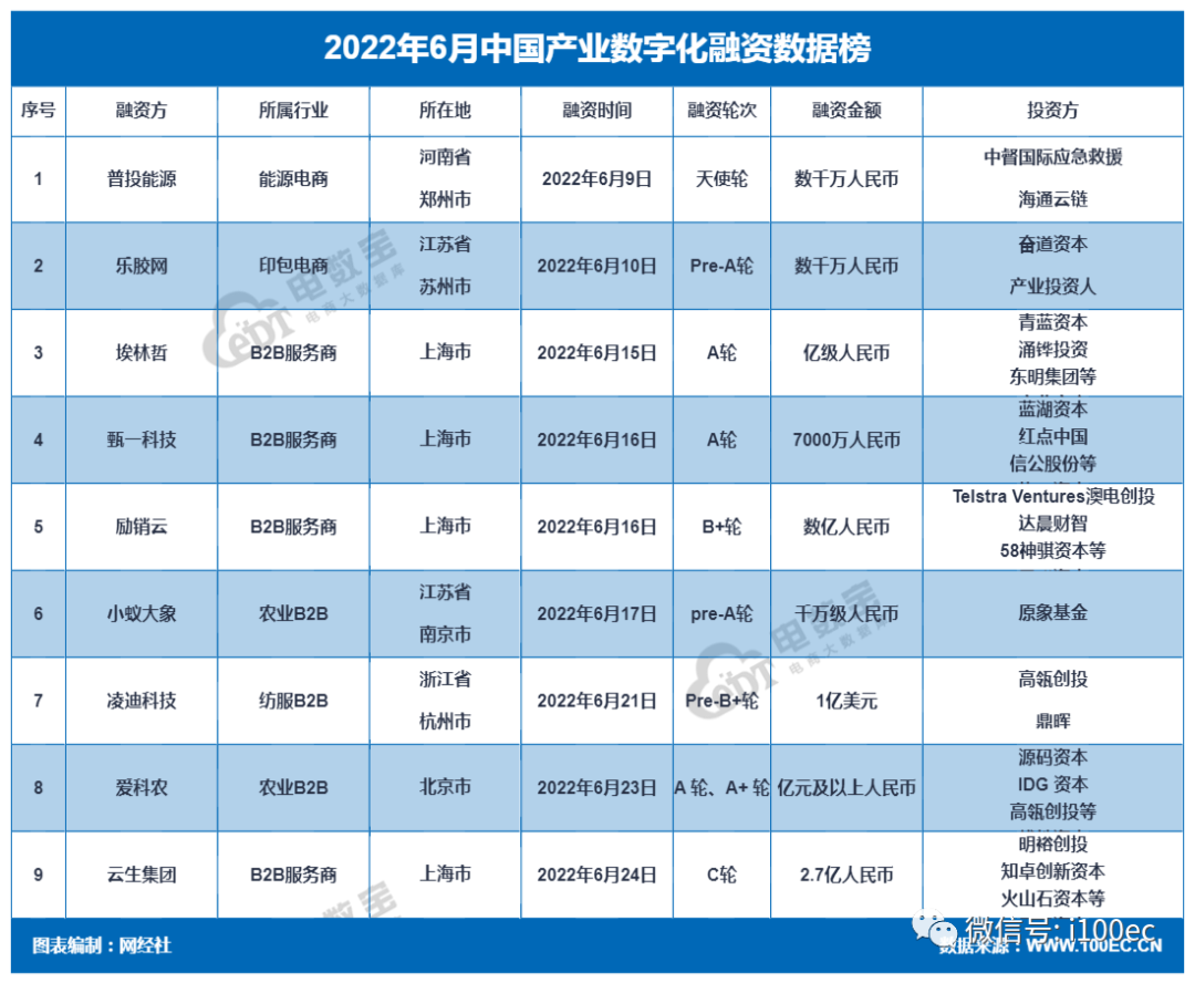 据网经社旗下电商大数据库"电数宝"(DATA.100EC.CN)监测数据显示,2022年6月产业数字化电商领域共有9家平台及服务商获得融资,分别是普投能源、乐胶网、埃林哲、甄一科技、励销云、小蚁大象、凌迪科技、爱科农、云生集团,融资总额超14.7亿人民币。