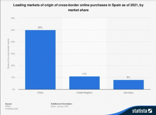 近年来,随着经济全球化,西班牙的贸易逆差也不断加大。而中国作为西班牙进口商品的主要来源国,中国商品在西班牙市场有着高额占比。Statista数据显示,中国商品占西班牙跨境采购的一半份额,是2021年西班牙跨境在线购物的主要来源国家,紧随其后英国的市场份额为 11%,而德国约占西班牙跨境电子商务市场的 8%。