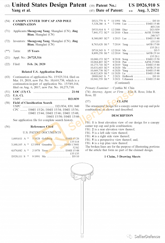 原告品牌:canopy center top cap and pole combination 帐篷装饰设计专利