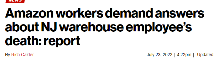 这一事件发生在7月13日,也就是几年会员日最火爆的第二天,在新泽西州某亚马逊FBA仓库(编号EWR9)一名员工在搬运作业过程中,倒在仓库二楼的地板上,昏迷几十分钟后才有人将其送去就医,但是抢救失败。