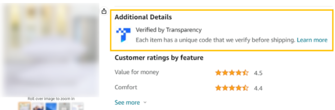 据悉,这个"小蓝标"就是Transparency(透明计划)标记。只要商品获得这个标志,listing五点描述下方的Additional Details(额外细节)部分就会出现"小蓝标"。