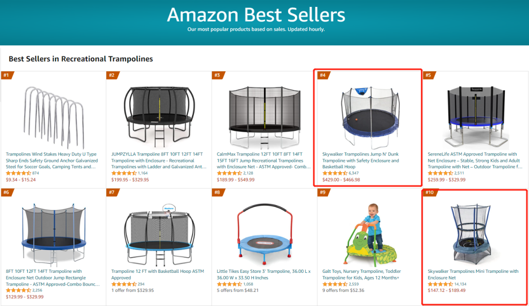 在亚马逊"休闲蹦床"类目中前10名中,SKYWALKER就夺得了2个席位。