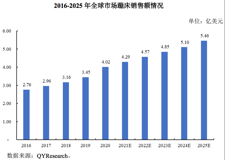 根据QYResearch报告,全球蹦床市场规模由2016年的2.76亿美元增长至2020年的4.02亿美元,年均复合增长率为9.81%,预计2025年将达到5.46亿美元。