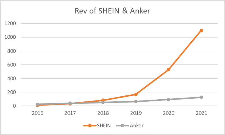这几个公司分别是出海服装,消费电子,物流,家具的成功代表。很有意思的是,5年前的2017年,SHEIN和Anker的收入非常接近,都在30-40亿。