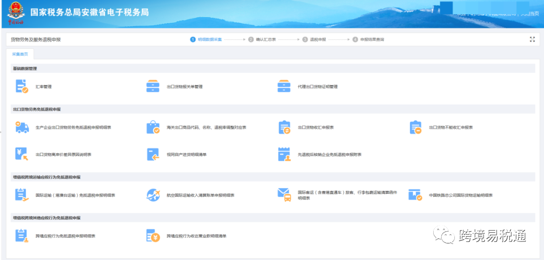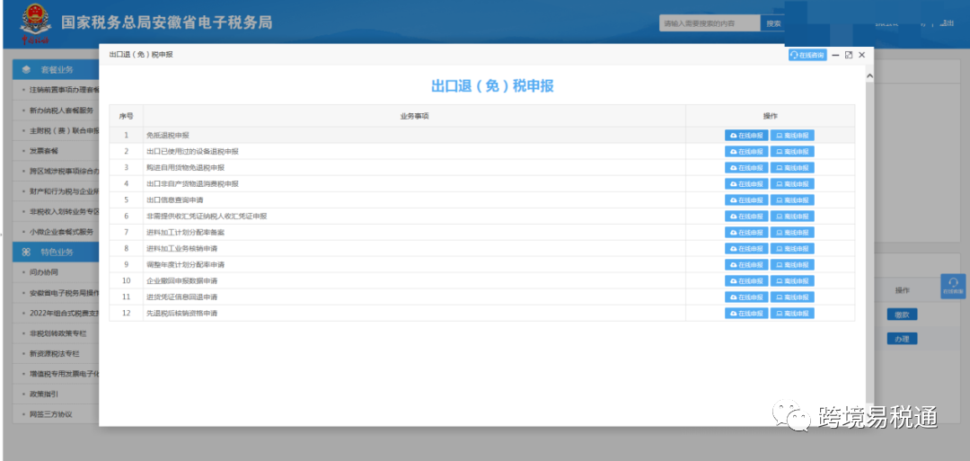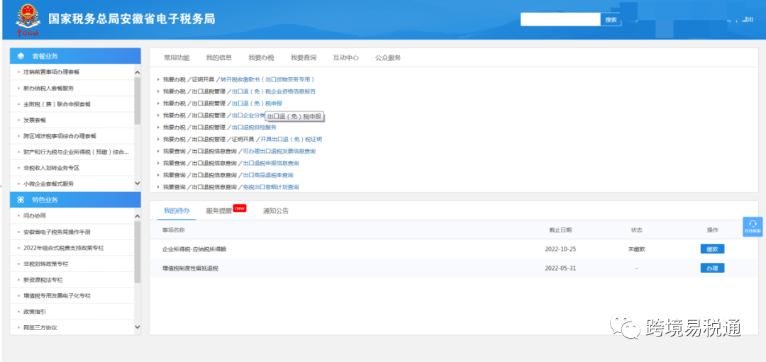 登录安徽省电子税务局,在检索框中找到出口退(免)税申报这一模块。
