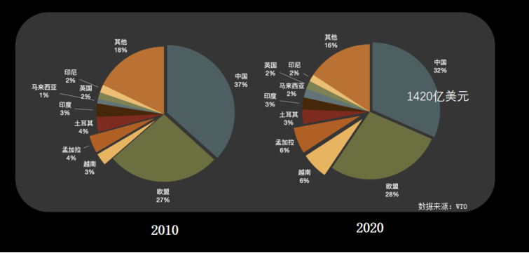 但是,越南和孟加拉国服装出口的快速增长,正在抢夺我国的服装出口订单,让我国的服装出口份额从2010年到2020年总共降低了五个百分比。