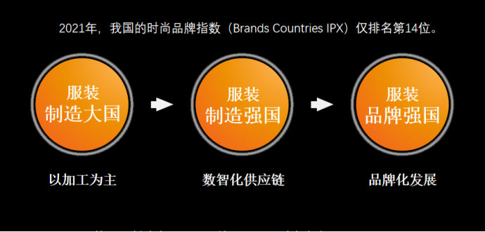 一方面我国服装产业在加工贴牌上优势减弱,另一方面,我国的自主服装品牌输出仍然有限。在全球服装品牌中,中国品牌只能占到1%。作为服装出口大国,我国服装行业却在国际上欠缺品牌影响力。2021年,我国的时尚品牌指数(Brands Countries IPX)仅排名第14位。这些数据表明,"品牌"的意识已经觉醒,可是却受限于经验,很难拿出切实有效地建设全球化品牌的落地规划。