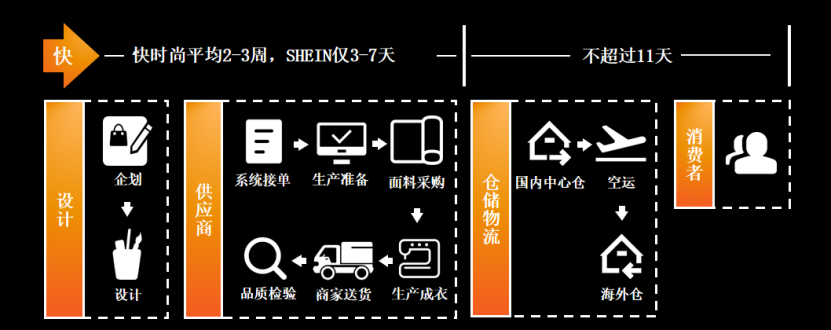 所谓"小单快返",就是依托数字化、智能化解决方案,将其网站和App的后台与供应链系统相连。公司首先以很小的首单量来测试市场反应,当消费侧有数据显示商品具备"爆款"潜质时,企业再将该商品返回工厂侧增加生产订单。通过生产端和销售端的链接和通过算法对销售数据分析,Shein 的爆款率达到了 50%、滞销率只有约 10%。