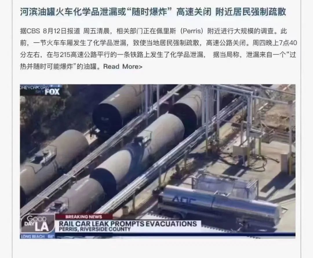 周四晚上 7 点 40 分左右,在 Perris 以北的 Harvill Avenue 和 Oleander Avenue 的一条与 215 高速公路平行的铁路上发生了泄漏事件。据当地消防局称,泄漏来自一个"过热并可能准备爆炸"的油箱,铁路站上方冒出大量浓烟。