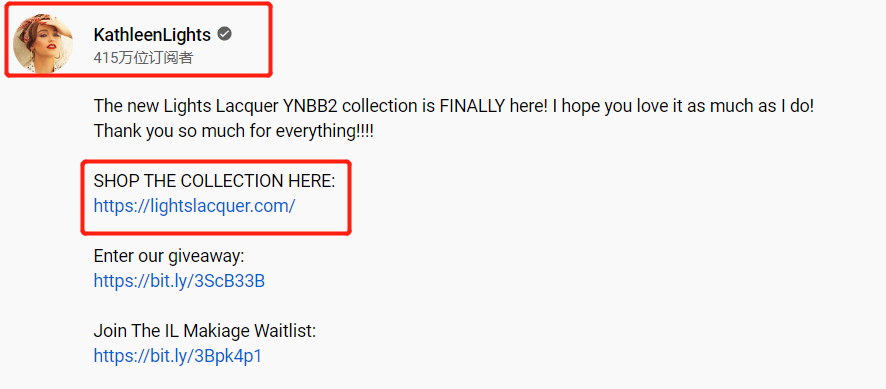在youtube上拥有415万的粉丝的KathleenLights被称为种草女王,她推荐的产品很多粉丝会跟风购买,KathleenLights在2019年创立了品牌lightslacquer,该品牌在前期基本靠KathleenLights的流量获取订单,并且在短时间内小有名气。
