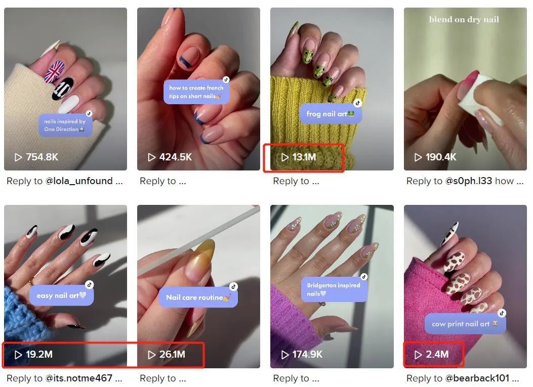 TikTok上关于指甲油,美甲的标签,均超过10亿播放,很多网友在标签内分享自己新做的指甲,有不少品牌通过TikTok标签获得很高的热度。
