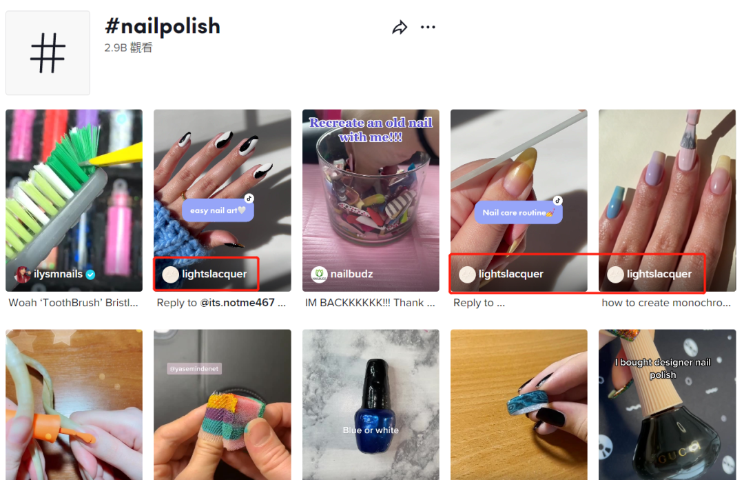 近期,该品牌的视频在TikTok指甲油标签中获得比较靠前的位置 ,前十个视频中有3个是lightslacquer官方发布的。