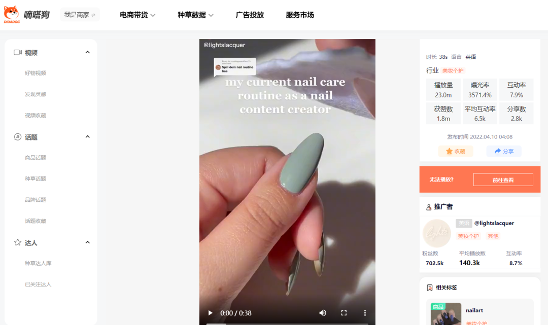 根据嘀嗒狗数据显示,视频由@lightslacquer在4-10号发布,获得2300万播放,获得点赞180万。