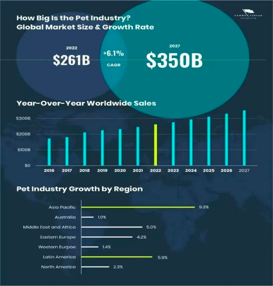 1.全球行业现状:在全球范围内,宠物市场已从2020年的2160亿美元增长到2021年的2320亿美元。这一数字在2027年飙升至3500亿美元。