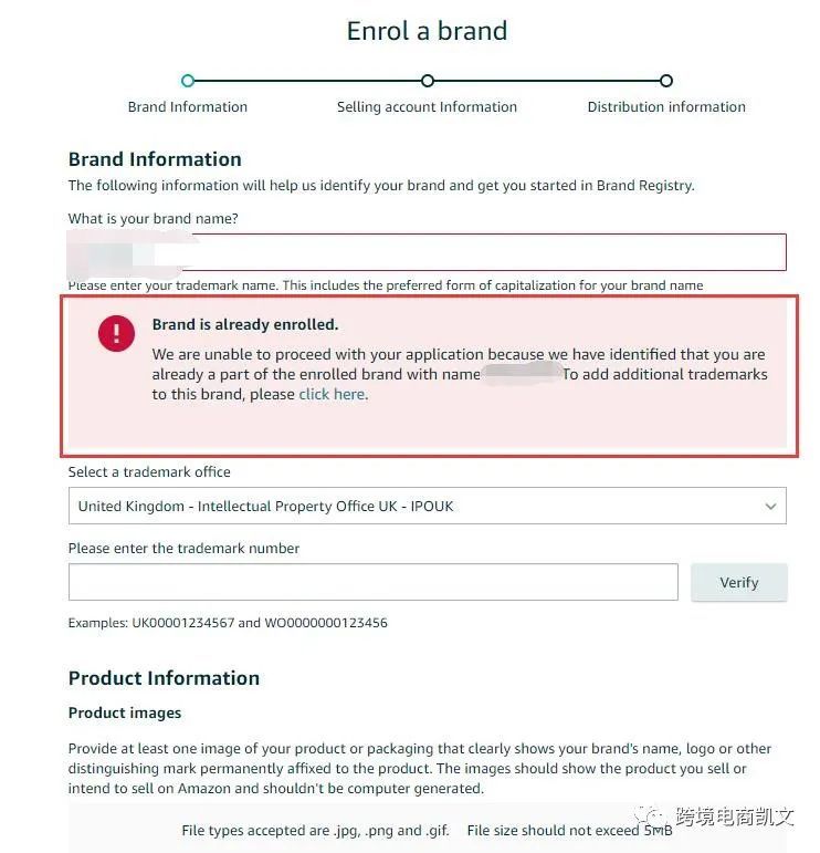 刚开始我在英国站店铺页面进去,直接进行品牌备案,等你输入品牌名字的时候,系统会提示你这个品牌在美国站已经备案过了。