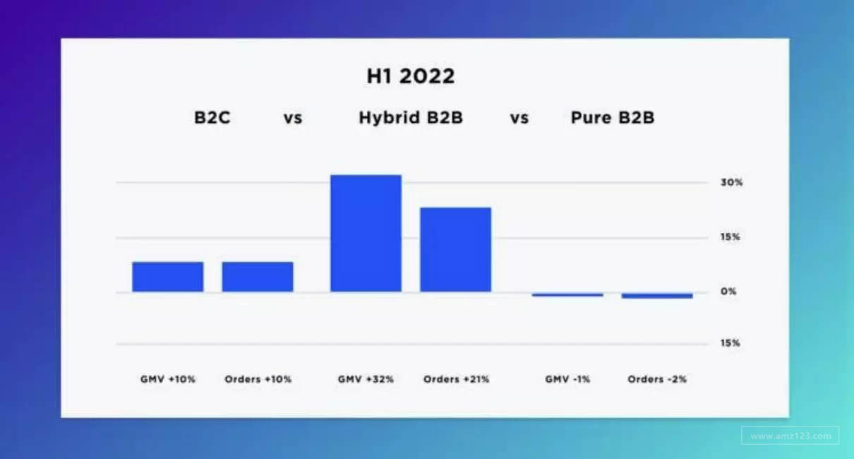 混合型B2B(同时销售B2C和B2B的商家)的销售增长更加明显。2022年上半年,美容美妆品类这一模式的订单量同比增长了21%,GMV同比增长了32%,AOV同比增长了9%。但纯B2B模式销售的GMV减少1%,AOV增加2%,订单减少2%。