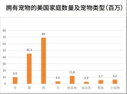 从这个数据中,我们可以看出美国拥有猫、狗的家庭数量是占比最多的,市场中对猫、狗的宠物用品的需求也就更大,市场规模也就更大。