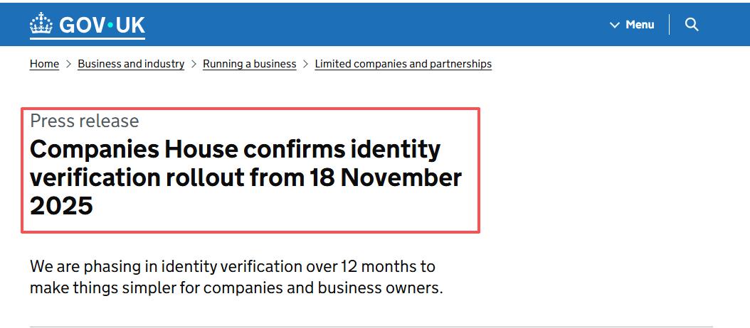 根据英国公司注册处(Companies House)最新规定,自 2025年11月18日起,所有英国公司的董事及重要控制人(UBO)均须完成身份验证!