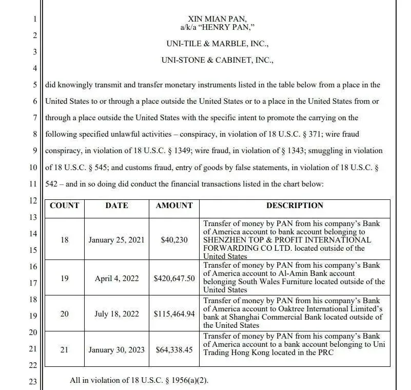 被提告的公司,分别是潘信勉在湾区经营的友利瓷砖云石(Uni-Tile & Marble, Inc.)、友利石材橱柜(Uni-Stone & Cabinet, Inc.),与王进华在中国深圳成立的物流公司(Shenzhen Top & Profit International Forwarding Co. Ltd.)。