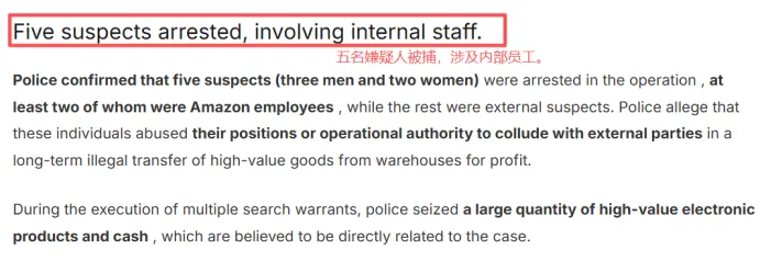 警方确认,此次行动共拘捕5 名嫌疑人(3男2女),其中至少两人为亚马逊内部员工,其余为外部涉案人员。警方指控,相关人员涉嫌利用内部职务或操作权限,与外部人员配合,长期非法转移仓库内的高价值商品,并从中牟利。
