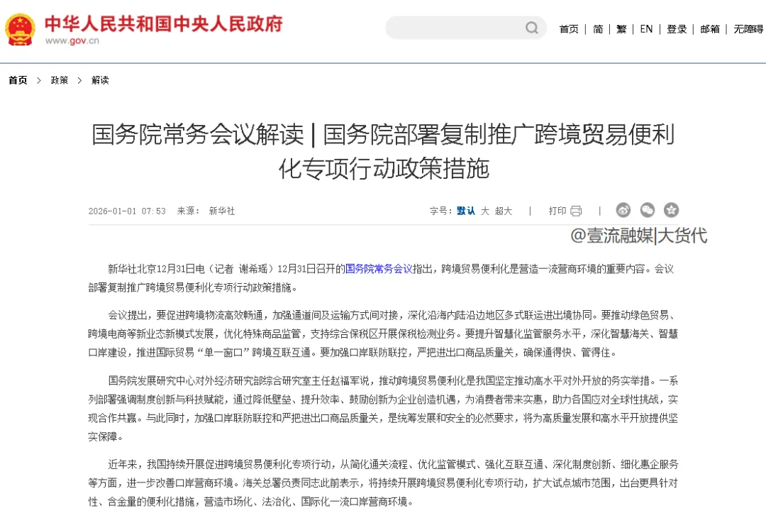 根据新华社报道,在12月31号召开的国务院常务会议中,国务院指出,跨境贸易便利化是营造一流营商环境的重要内容。
