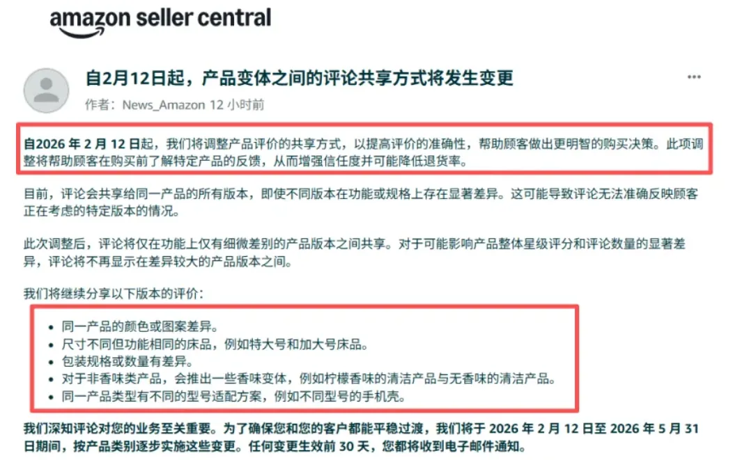 2026年1月15日,亚马逊官方正式宣布,将对产品变体的评论共享规则进行重大调整!新规将于 2月12日正式生效,并按类目分阶段推进,预计5月31日前全面落地。