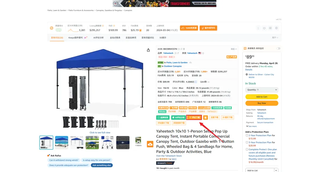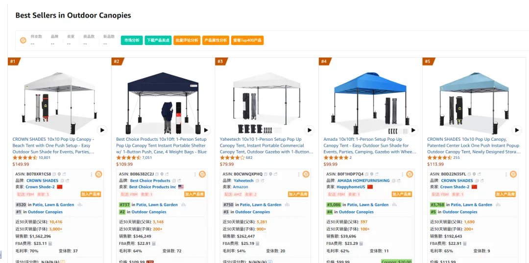 下面这个案例我将使用popup canopy这个类目的前50名的评论作为例子,来使用上面分析评论的方法来挖掘类目的痛点,卖点和未被满足的需求,人群画像是怎样的。