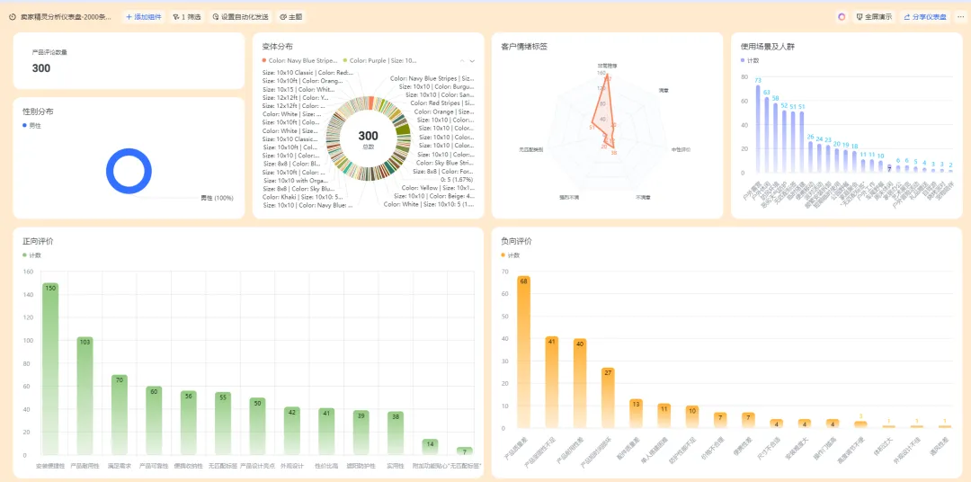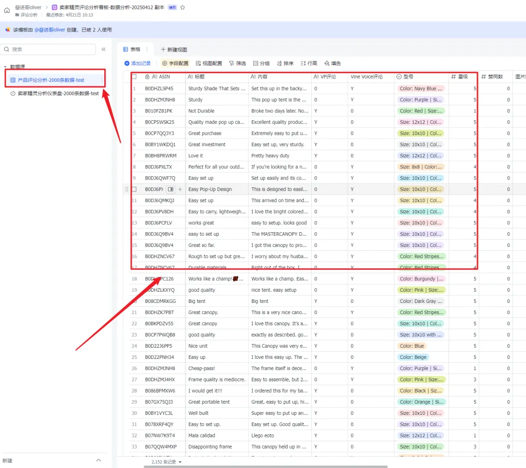 最近卖家精灵的新出来的分析评论的表格比较符合我们整体评论需求挖掘的方法,这里我不重复造轮子。让我们先站在巨人的肩膀上,使用我经过修改的卖家精灵分析评论的飞书模板进行分析,模板地址在这里卖家精灵评论分析看板-数据分析-20250412 副本
