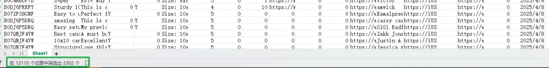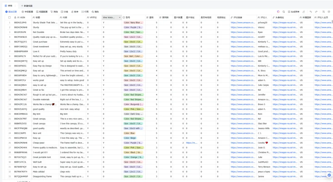 通过影刀操作卖家精灵插件批量下载popup canopy 前50名ASIN的评论,并合并到一个约2000行数据的表格(如果不懂影刀怎么操作,可以通过卖家精灵插件上的"下载评论"按钮逐个ASIN下载再合并,可以通过这个影刀链接来使用我设计的批量下载亚马逊评论应用:https://api.winrobot360.com/redirect/robot/share?inviteKey=f94e6e2429f523b9)。由于总体下载的评论数据比较多,达到1W2条,飞书免费版的多维表格每个表都有一个条数的限制,而且条数过多也会导致总体表格容易卡阿顿,因此本次案例只采用2000条数据作为展示。