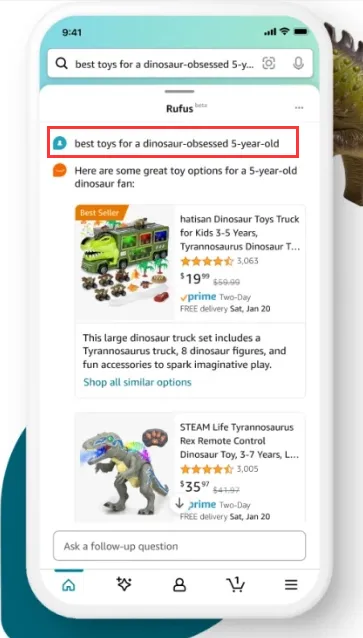 1. 自然语言交互:用户可以用完整、口语化的问题发起搜索,例如"适合夜间跑步穿的上衣"或"新手妈妈如何快速冲泡奶粉"。Rufus能直接理解这些长尾问句,并得出相关结果。