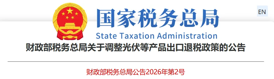 近期,财政部会同税务总局发布了公告,明确自2026年4月1日起取消光伏等产品增值税出口退税,涉及硅片、组件、逆变器等249项产品;电池产品分两阶段调整,2026年4月1日至12月31日退税率由9%降至