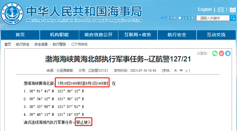 8月3日前,渤海、黄海、东海、南海等海域因军事演习、实弹射击等,实施禁航。一、渤海海峡黄海北部执行军事任务--辽航警127/21据大连海事局消息:渤海海峡黄海北部,7月18日1600时至8月1日1600时,在以下两个区域内组织重大军事活动:1.38°51′41″N 121°38′12″E2.38°34′12″N 121°38′12″E3.38°33