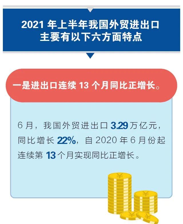 其中,出口9.85万亿元,增长28.1%;进口8.22万亿元,增长25.9%。6月份当月,我国外贸进出口3.29万亿元,同比增长22%。