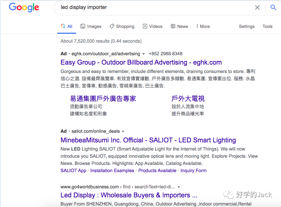 举个例子,你搜LED display wholesaler,这个时候会出现很多阿里巴巴,环球资源,中国制造网的信息,因为这些网站提供的都是批发商资料。