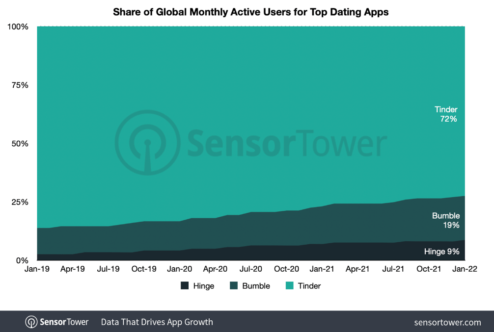 交友 App 的月活用户占比变化 | 图片来源:Sensor Tower