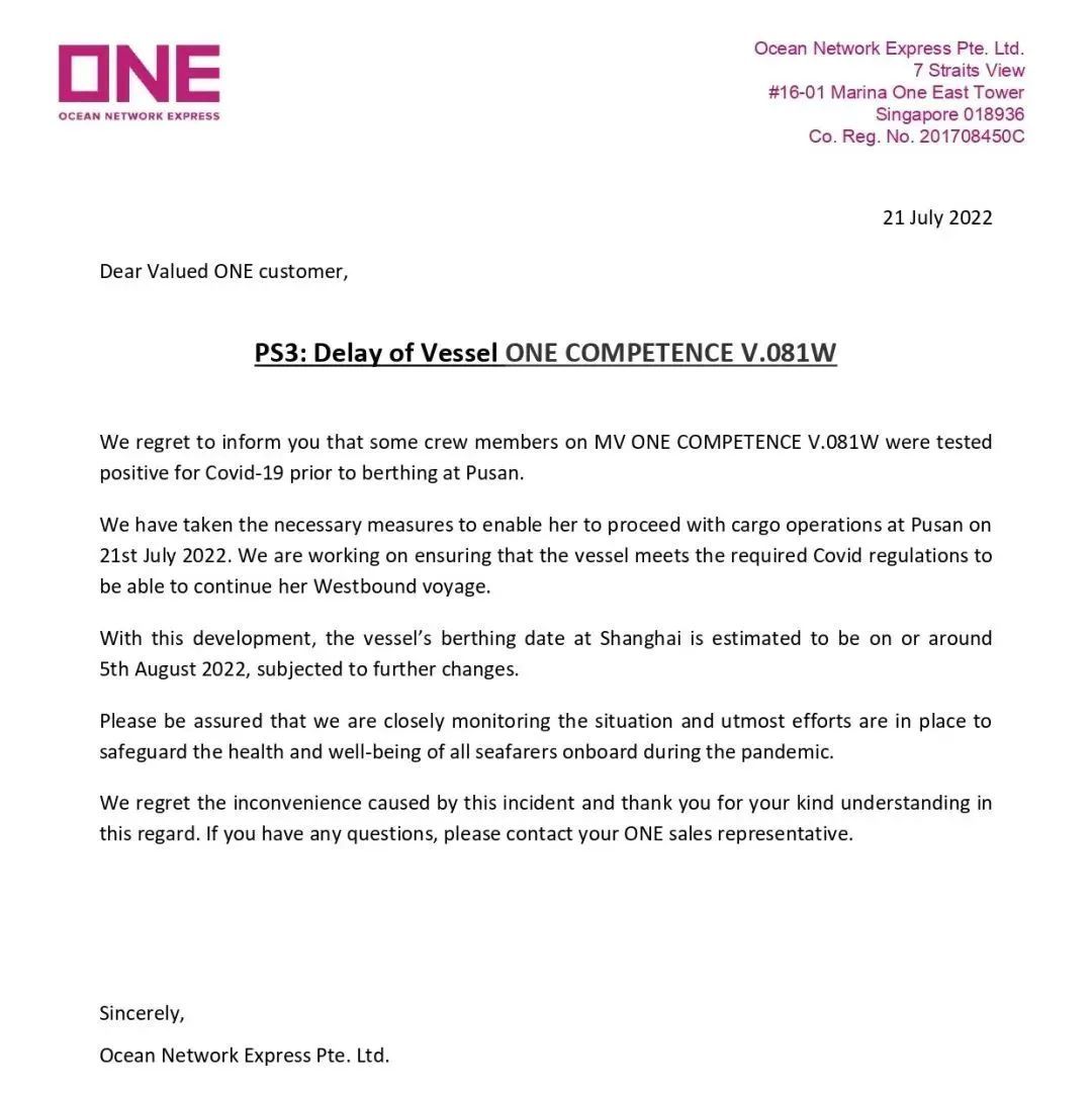 同时,ONE还发布了该船的船期变更通知,上海港原定ETD为7月23日,现更改为8月6日。变更信息如下 :