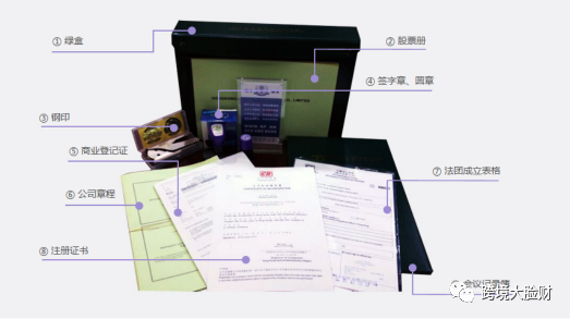 香港公司注册完成后,一般都会收到一个绿盒,里面就包含着香港公司的全套资料,包括:1、绿盒2、香港公司证书:公司注册证明书(CI)、商业登记证(BR)3、香港公司章程4、香港公司法团成立表格(NNC1)5、香港公司董事会议记录簿6、香港公司股票册7、香港公司印章3枚:钢印、圆章、签字章8、注册易收据(付款凭证)