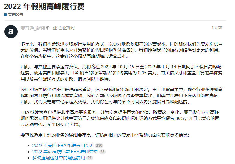 将于2022年10月15日至2023年1月14日期间,对于使用美国和加拿大FBA的商品收取"销售旺季配送费",平均每件商品收费0.35美元。