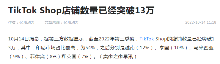TikTok今年在东南亚市场获得了高速发展。最新曝光的数据显示,TikTok小店店铺数量已经突破13万个,其中东南亚市场的店铺数量占比高达97%。