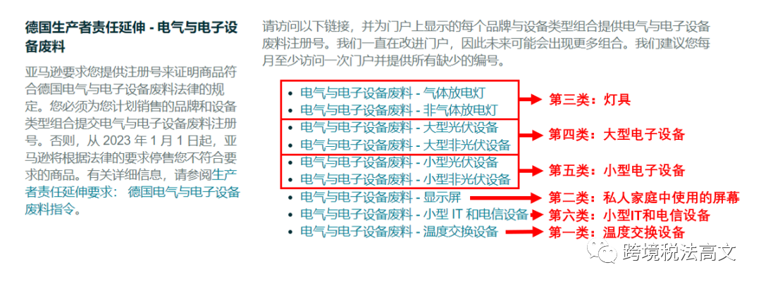 复制以下链接至浏览器,登录亚马逊卖家平台,前往生产者责任延伸要求:德国的电气与电子设备废料指令帮助页面,查看每种设备类型的合规门户链接。