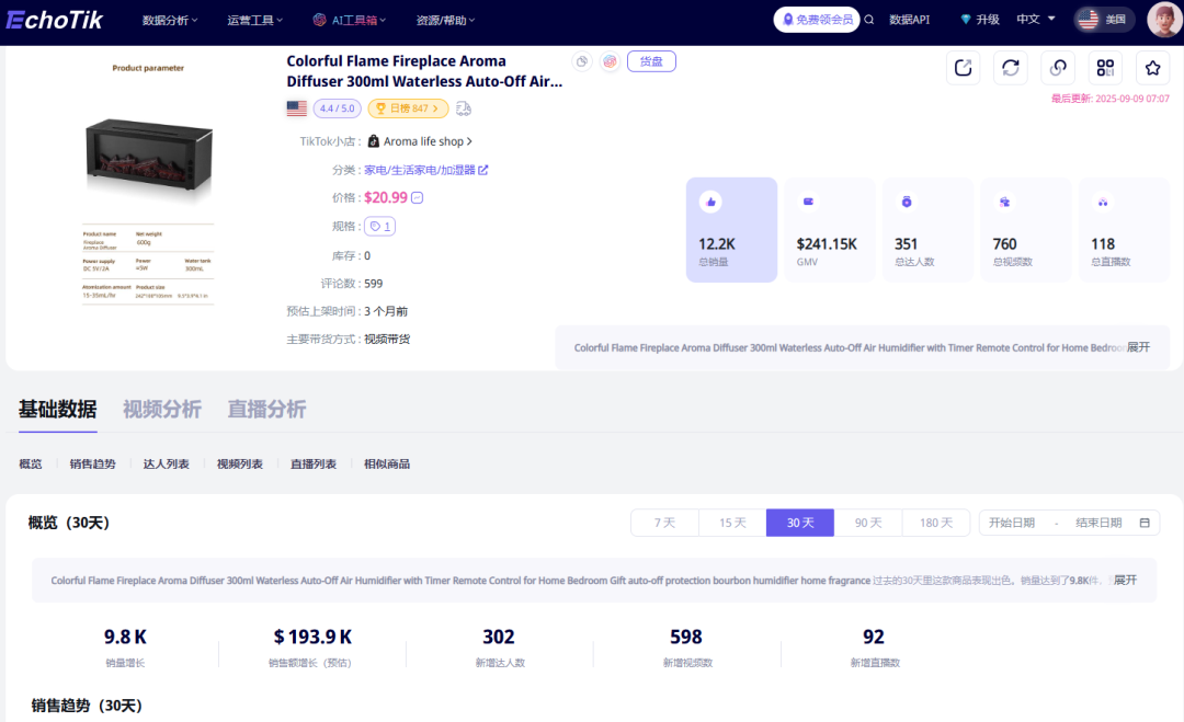 日前,TikTok 美区生活家电类目里,一款来自 Aroma life shop 品牌的香薰加湿器就彻底火了。这款定价约 20美元的产品,上架并不久却收获了超高人气。
