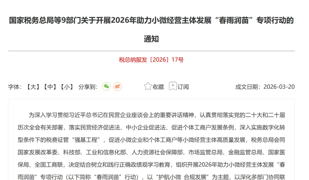近日,国家税务总局会同国家发展改革委、科技部、工业和信息化部、人力资源社会保障部、市场监管总局、金融监管总局、国家医保局、全国工商联等九部门印发通知,共同开展2026年助力小微经营主体发展"春雨润苗"