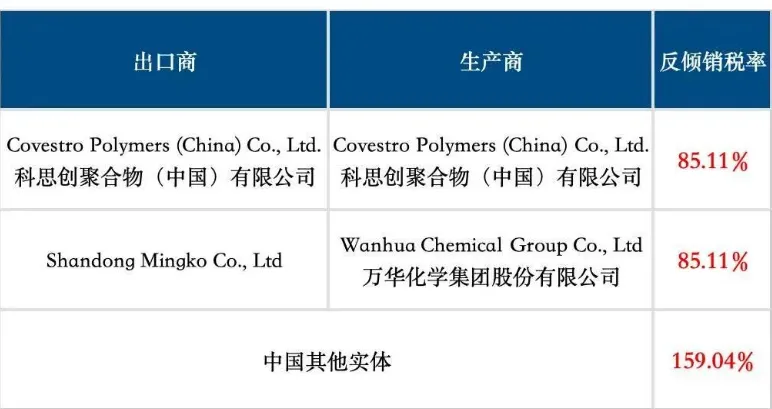 2026年4月8日,美国商务部发布公告,对进口自中国的二苯基甲烷二异氰酸酯(Methylene Diphenyl Diisocyanate)作出反倾销肯定性终裁,裁定中国生产商及出口商的反倾销税率为85.11%—159.04%。
