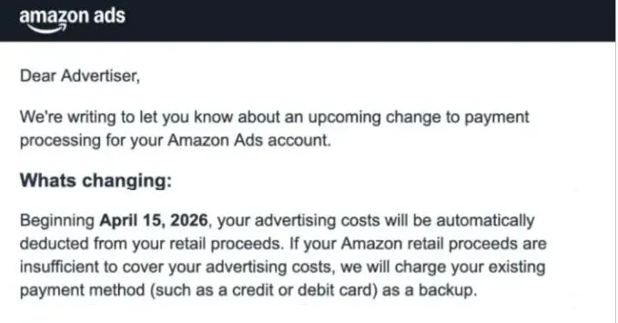 事情的缘由,是亚马逊在 4 月初向卖家后台推送通知,宣布从4 月 15 日起,对广告费用的支付方式进行强制性调整。